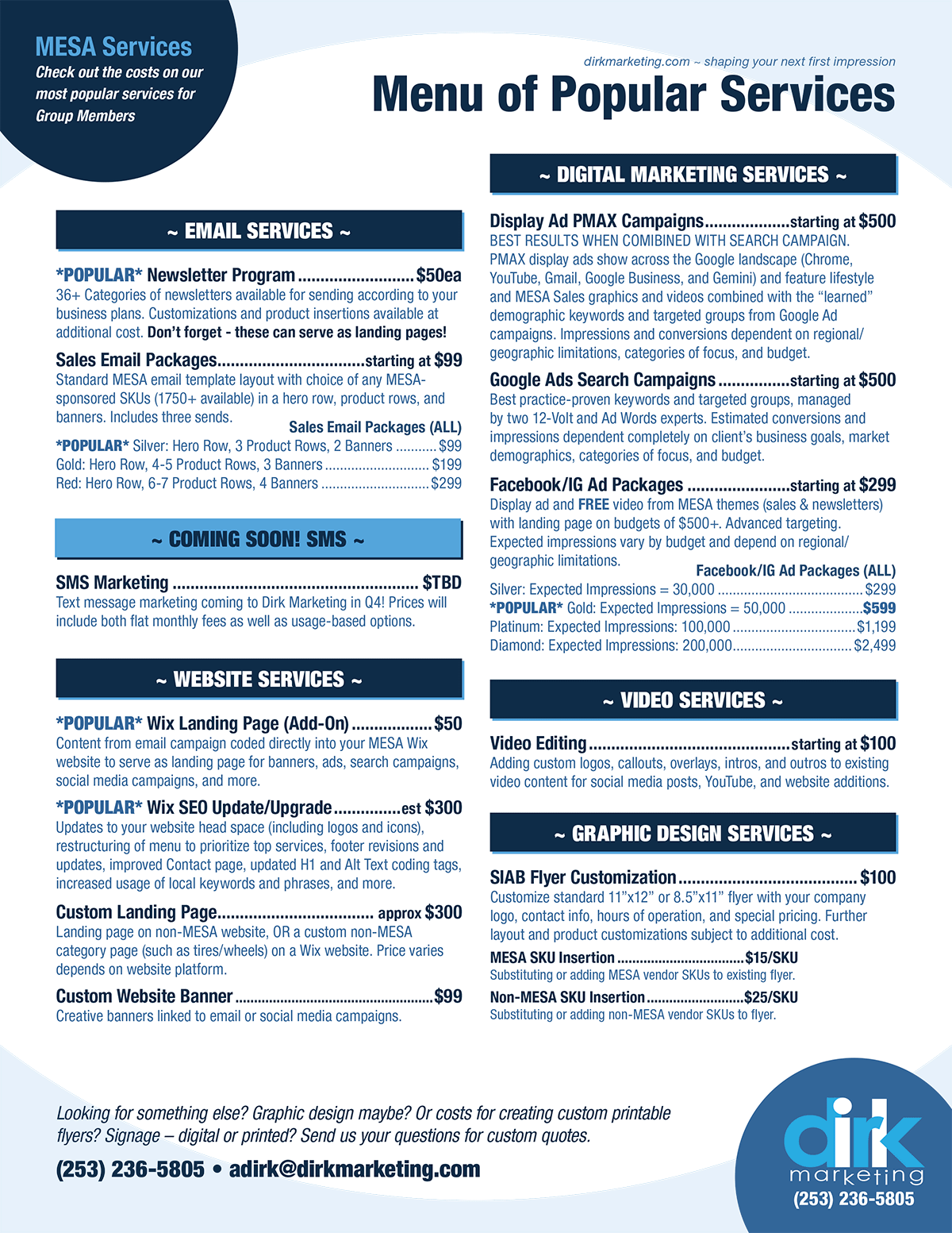 M.E.S.A. is the 12-Volt industry’s first and only Member-owned retailer marketing and selling Group, and Dirk Marketing has been working with you since Year One!
